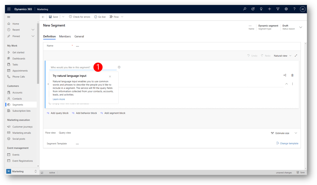 You can now use natural language sentences to build or view segments in Dynamics 365 Marketing (public preview by Oct 1, 2020). Use simple words to specify the attributes and logic for the segment you want to target so you can reach the exact audience you are looking for. For example, using natural language, you … Continue reading Talk to your Segment Builder