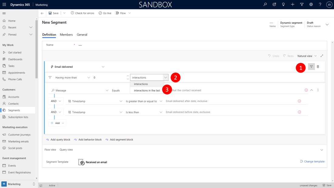 So you want to build a segment of contacts in Dynamics 365 Marketing, who received your invitation email within the last week. You tried the template "Received an email" but apparently it allowed only for absolute dates. You are looking for a date span relative to 'now'. The Show/hide interaction filters button to the rescue. … Continue reading Segment Filter button to the rescue