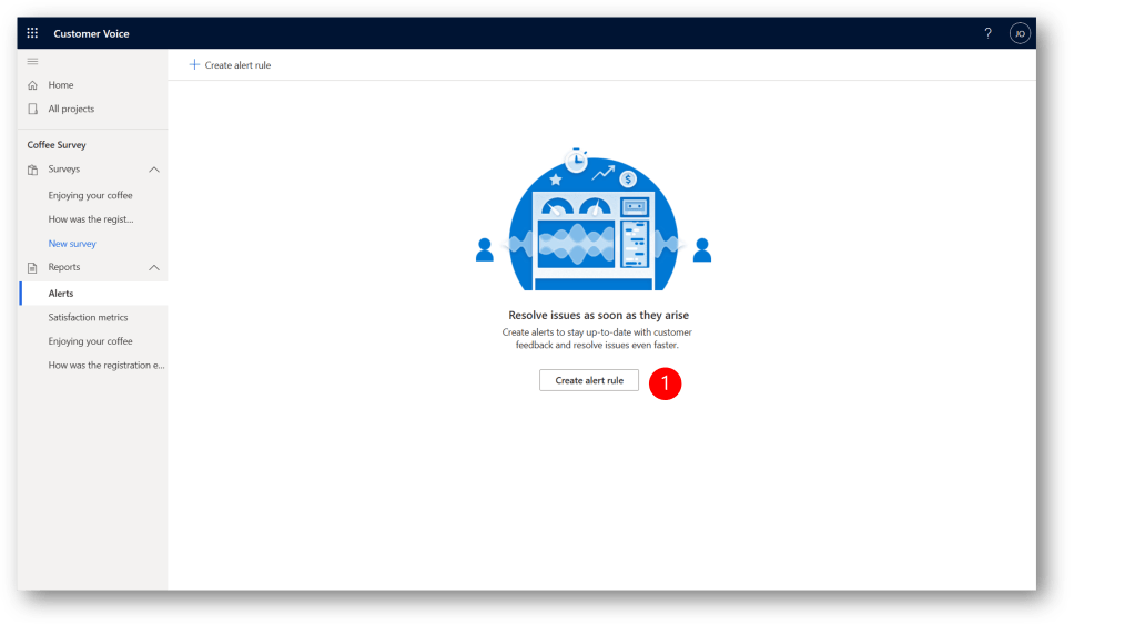 I’ve defined a satisfaction metric – Sentiment – based on the text received in a response to a question (1) and can now click Alerts (2) to set up an alert