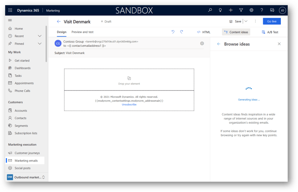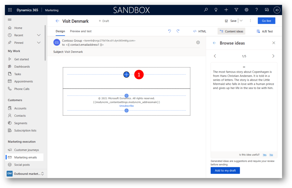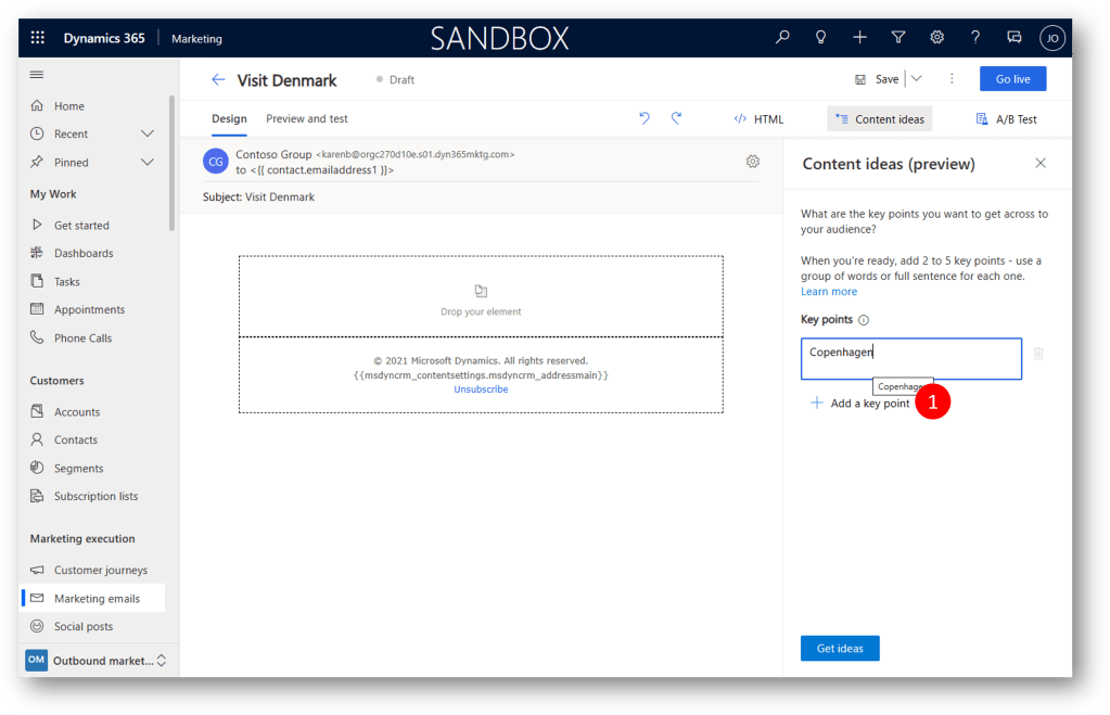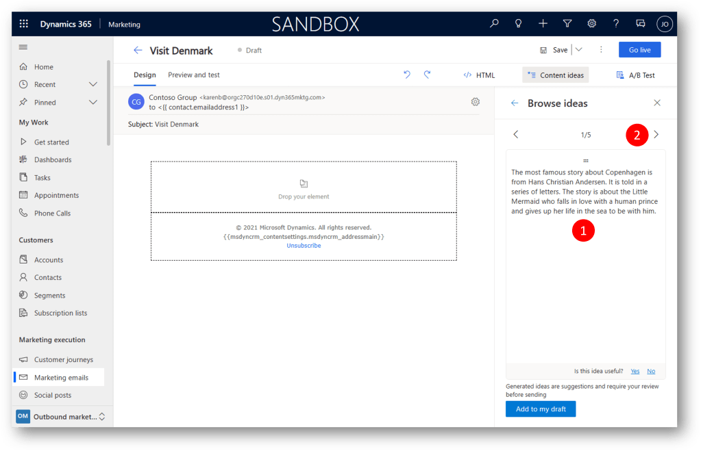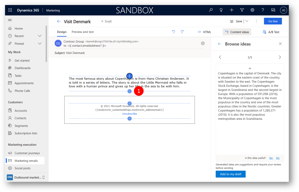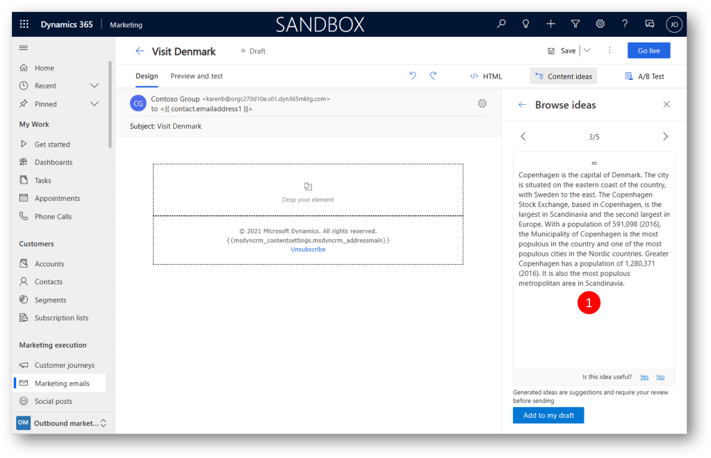 Content ideas is a new (preview) feature in Dynamics 365 Marketing, that helps you discover new ways to express your thoughts, helping you move from email concept to completion faster.