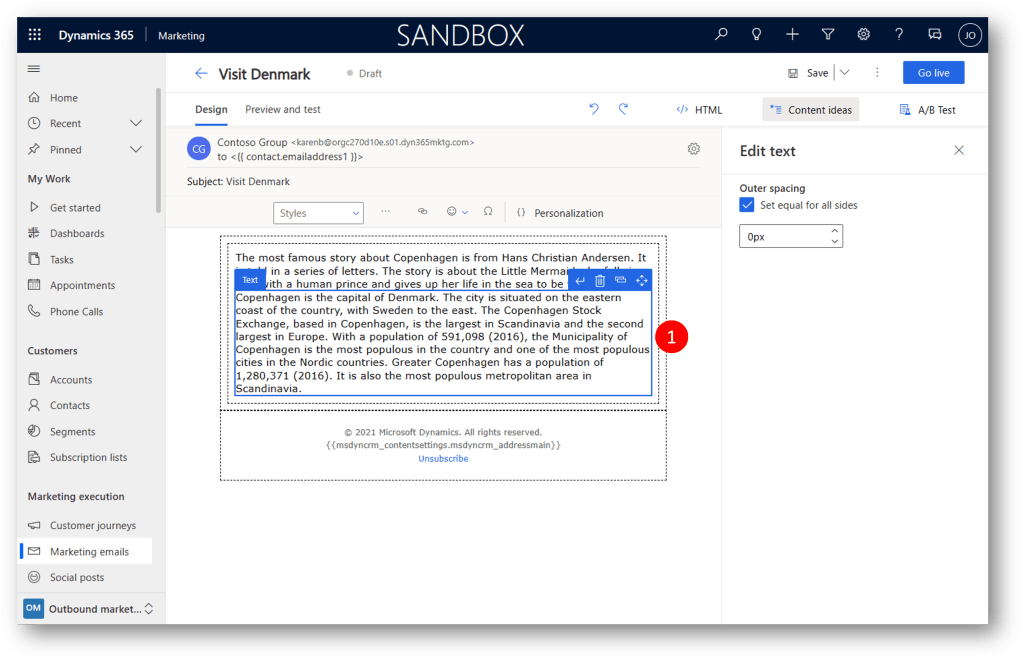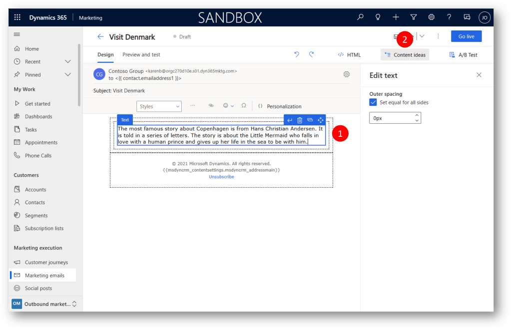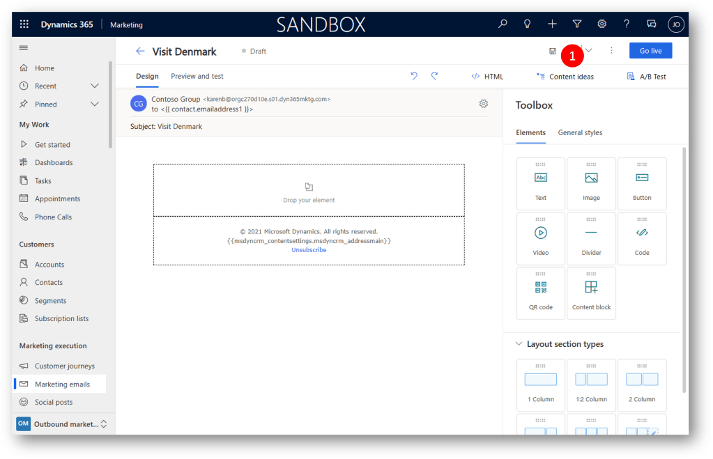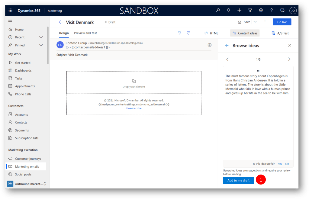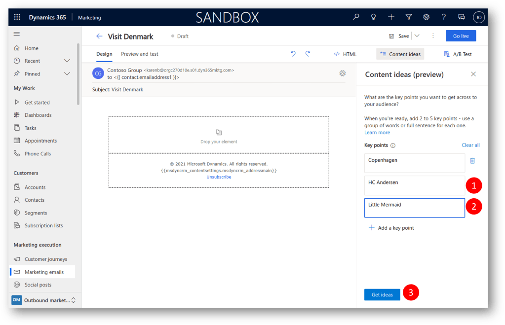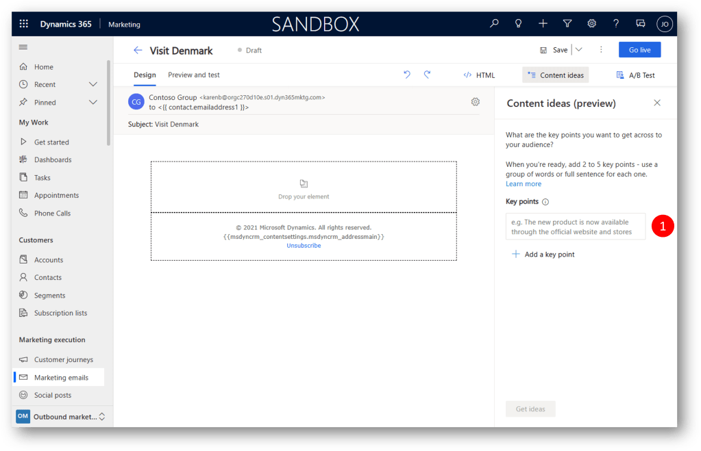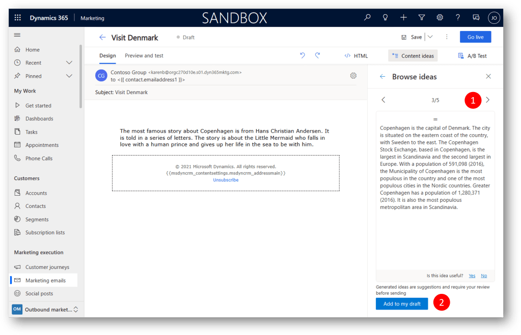 Content ideas is a new (preview) feature in Dynamics 365 Marketing, that helps you discover new ways to express your thoughts, helping you move from email concept to completion faster.