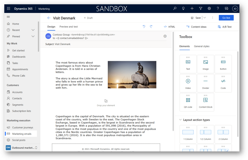 I create a draft email and start thinking about how to attract visitors to Copenhagen. I notice a new feature in the top right corner of my email editor – Content ideas